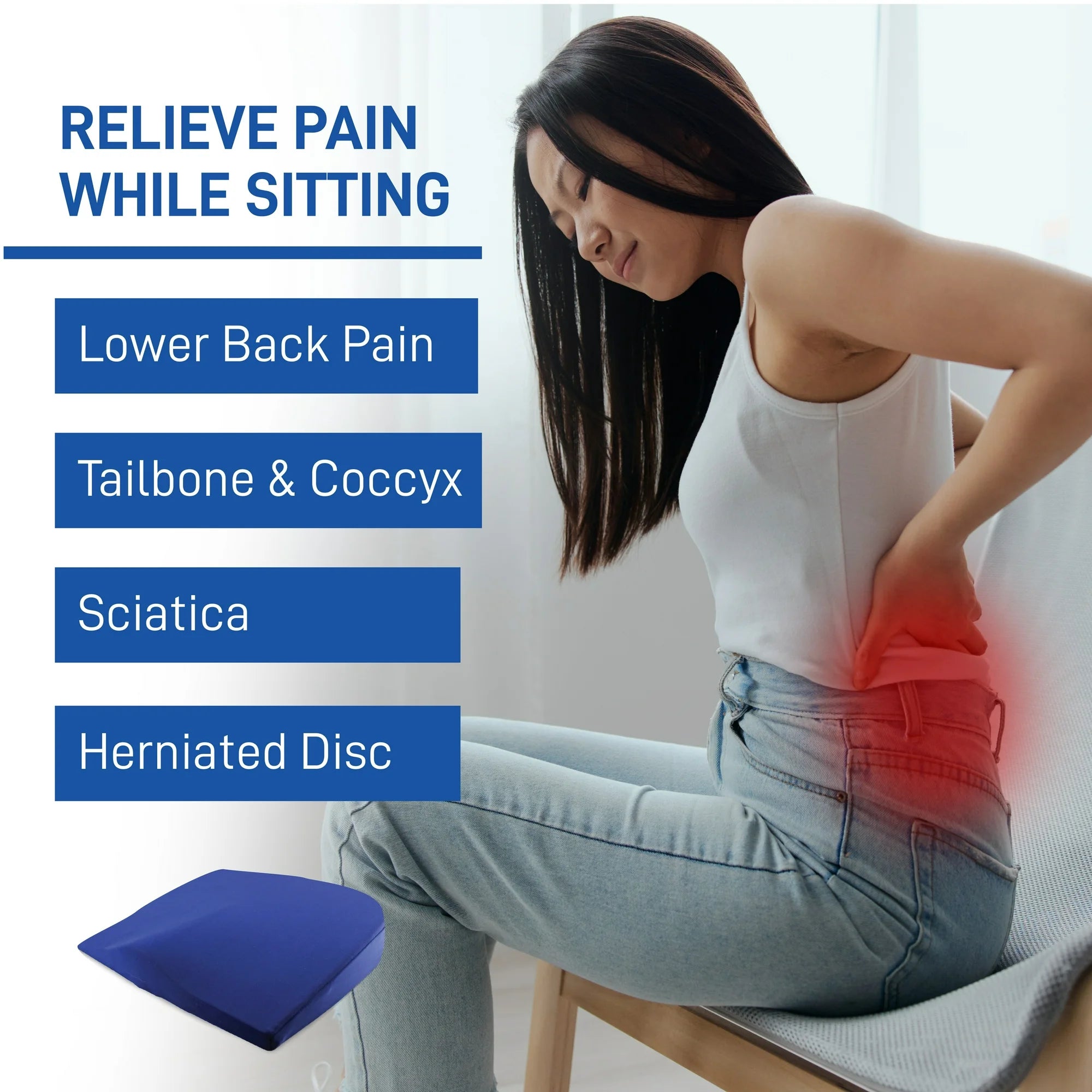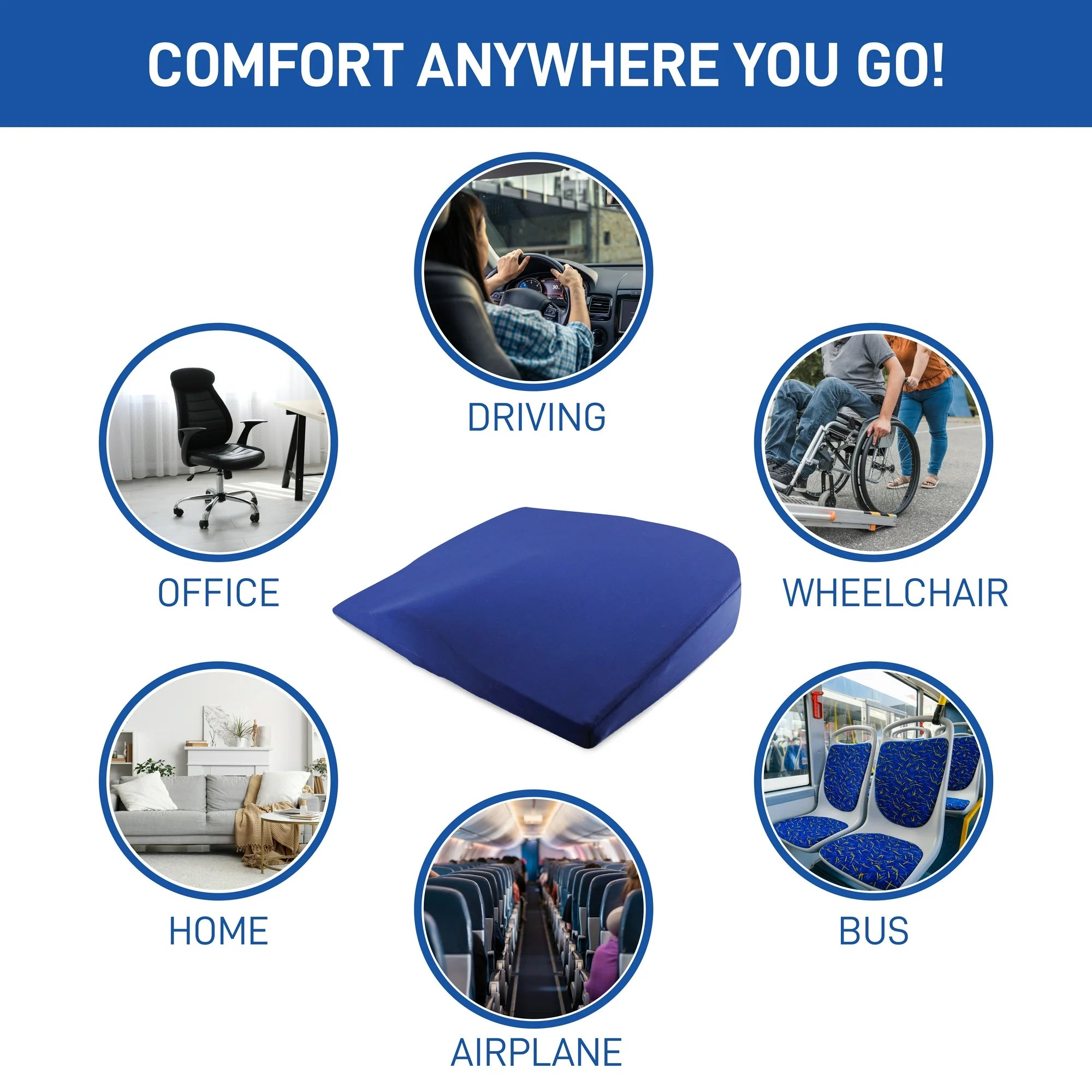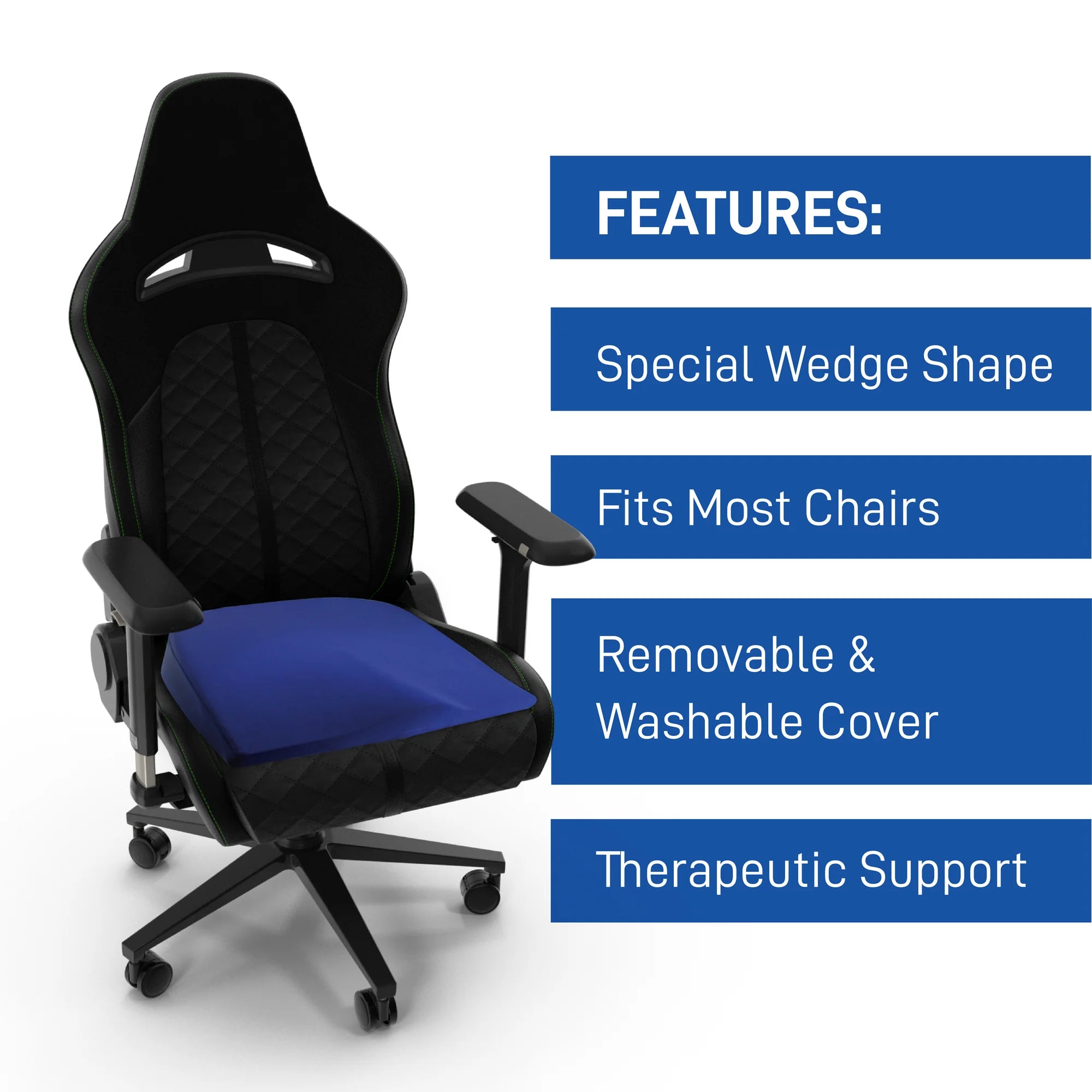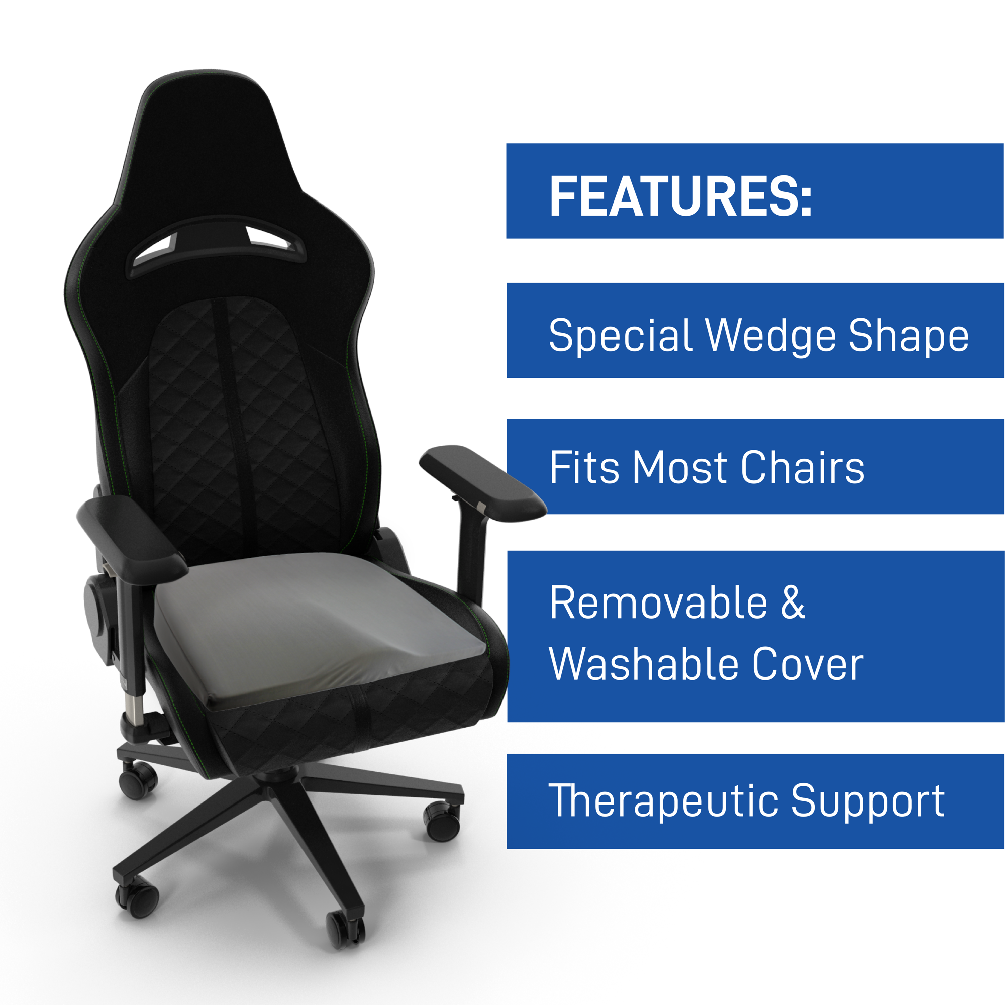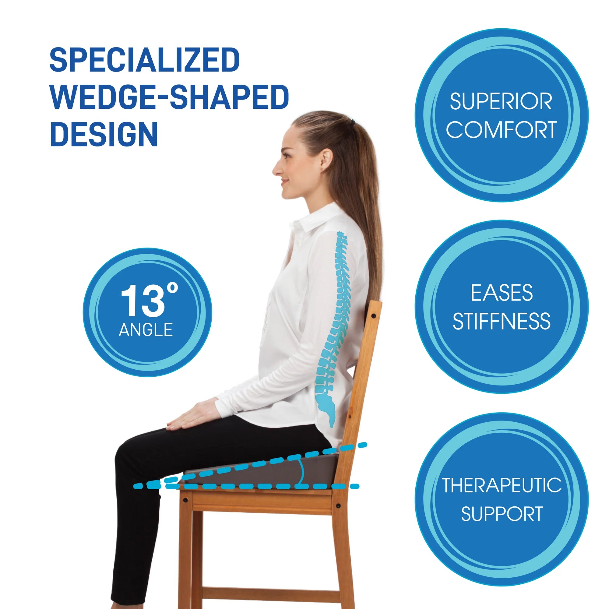 Heat-activated memory foam cushion provides support and comfort by molding itself to fit your body shape. The wedge-shaped design helps maintain a healthy posture. Regular use keeps your neck, shoulders, and spine in alignment, which reduces spinal pressure and helps improve posture. Includes a removable and washable cover available in either blue or gray.